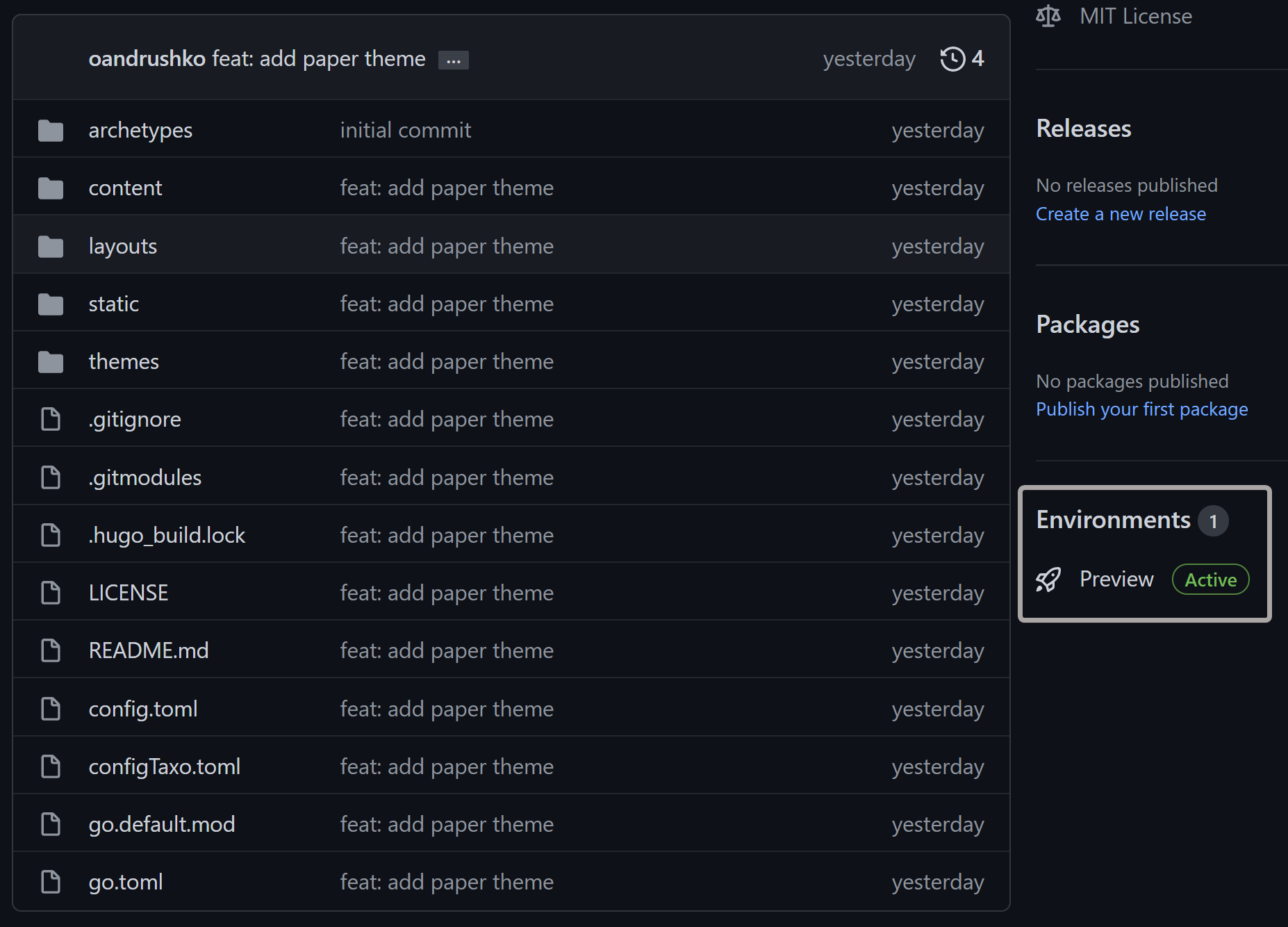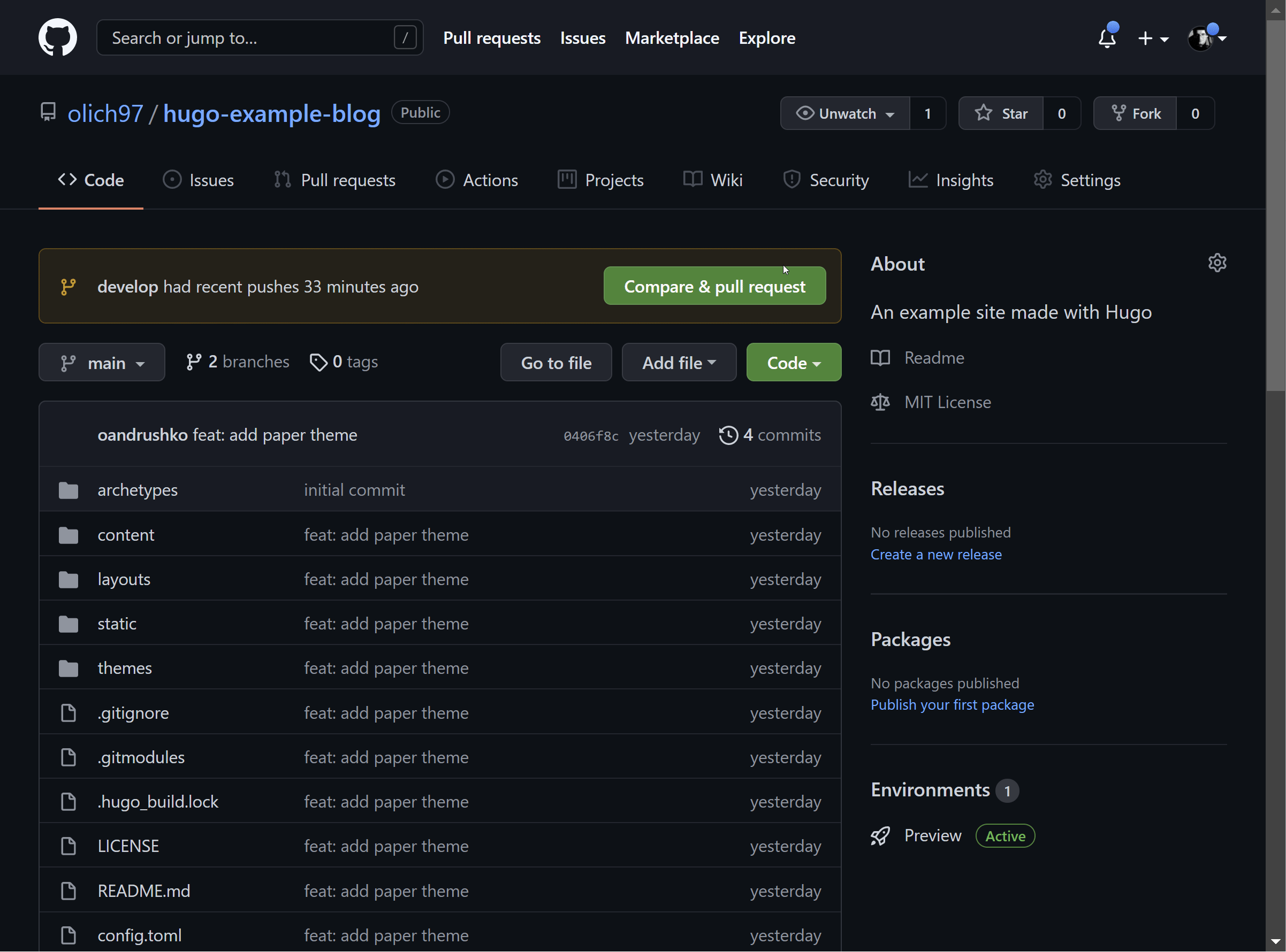 themes/hugo-paper/exampleSitefolder to the root website folderhugo-example-blog. - Modify