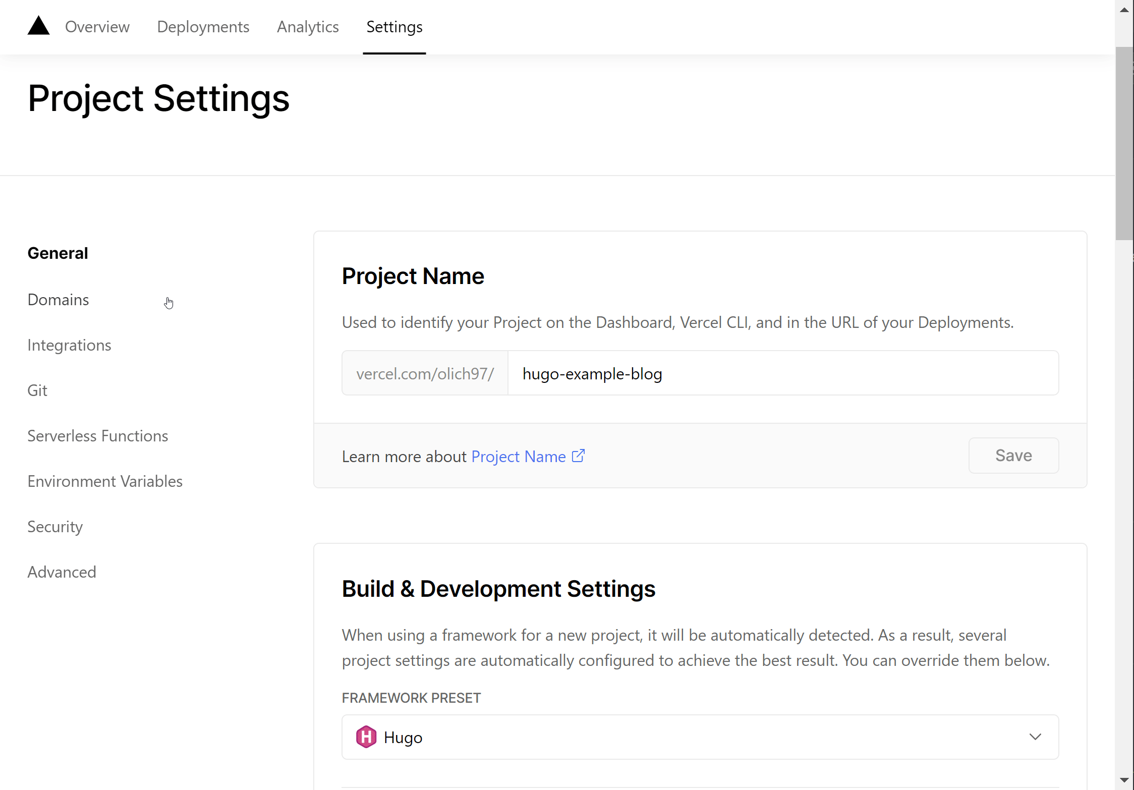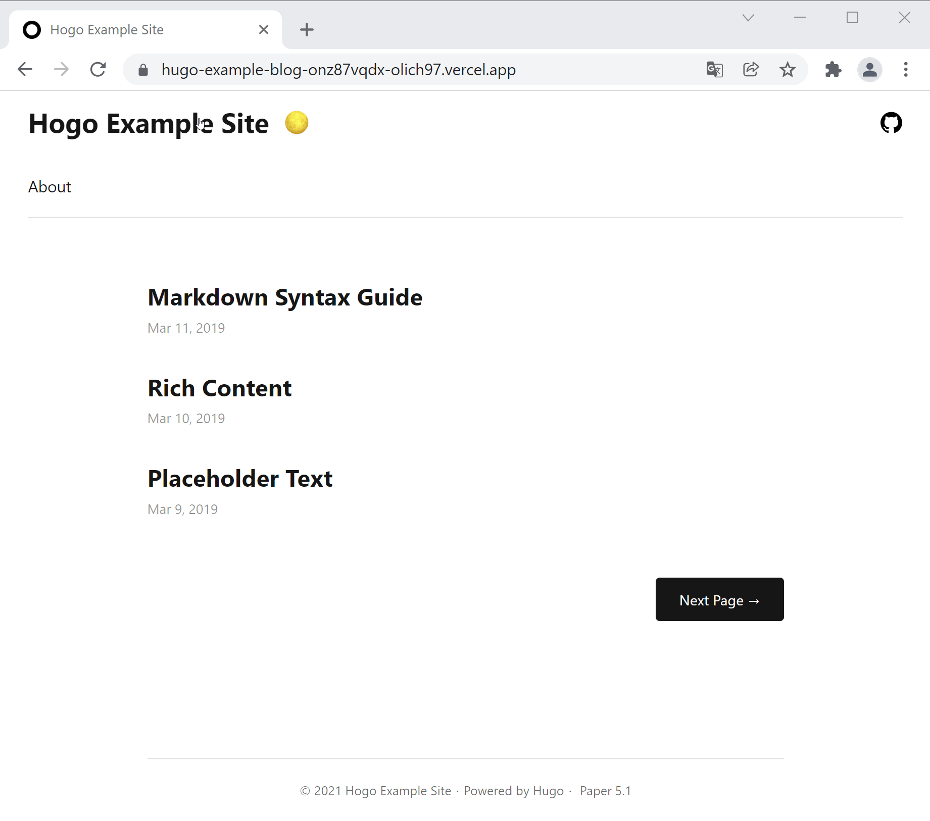 Now it could be navigated from free vercel domain assigned to our website: https://hugo-example-blog.vercel.app.