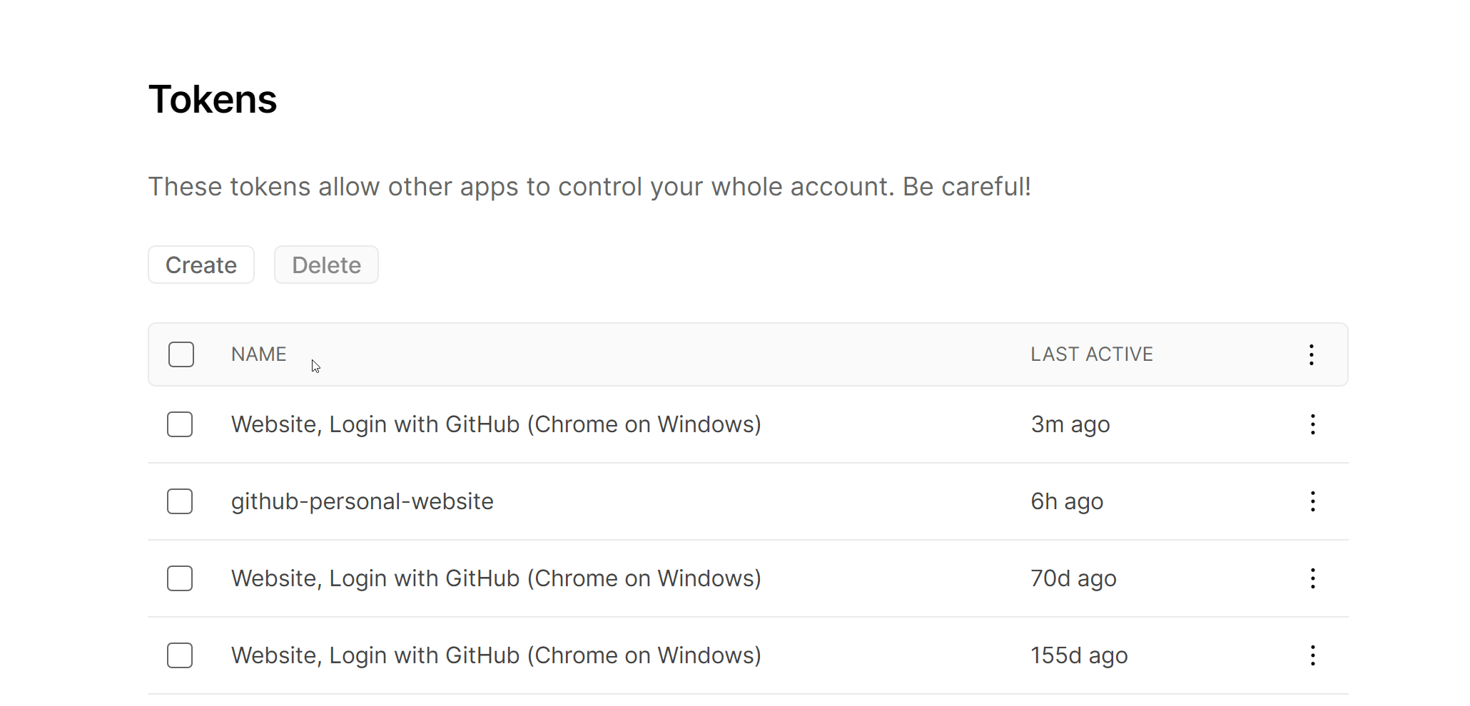 For generation a new Account Token just visit https://vercel.com/account/tokens and click on `create', give it a name (in my case ‘hugo-example-site’) and save it for later use.