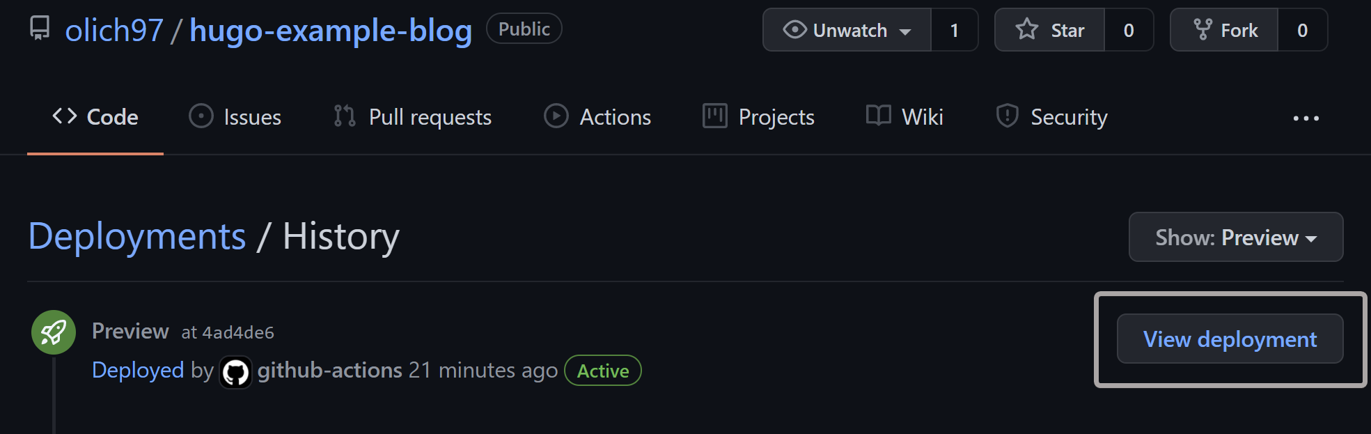 Now we can view our preview deployment just by clicking on View deployment link inside GitHub Project deployments page: