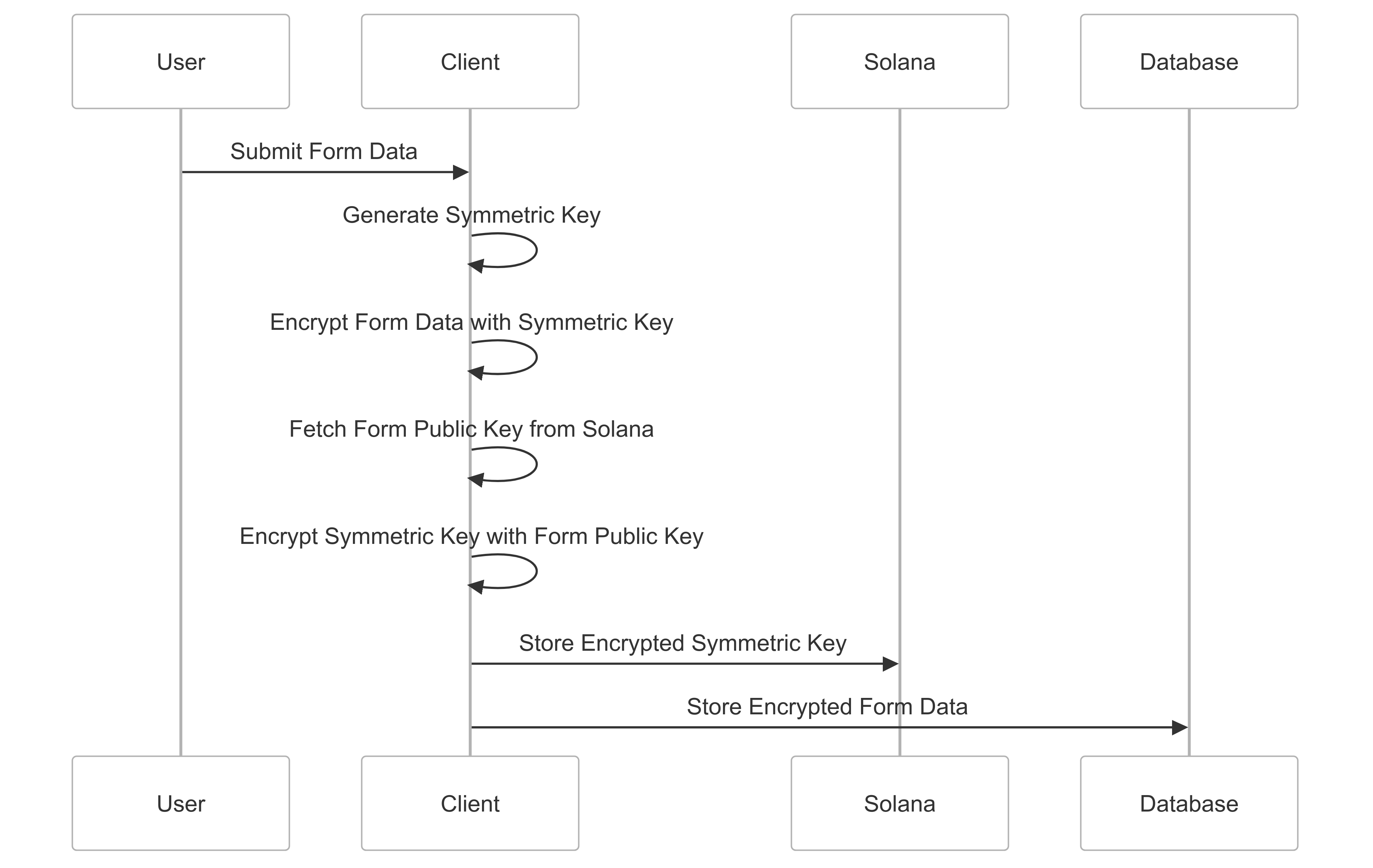 Formana employs a sophisticated hybrid encryption system to secure form submissions. This system combines asymmetric (public-key) and symmetric encryption to provide both security and efficiency, while integrating with the Solana blockchain for enhanced integrity and transparency.